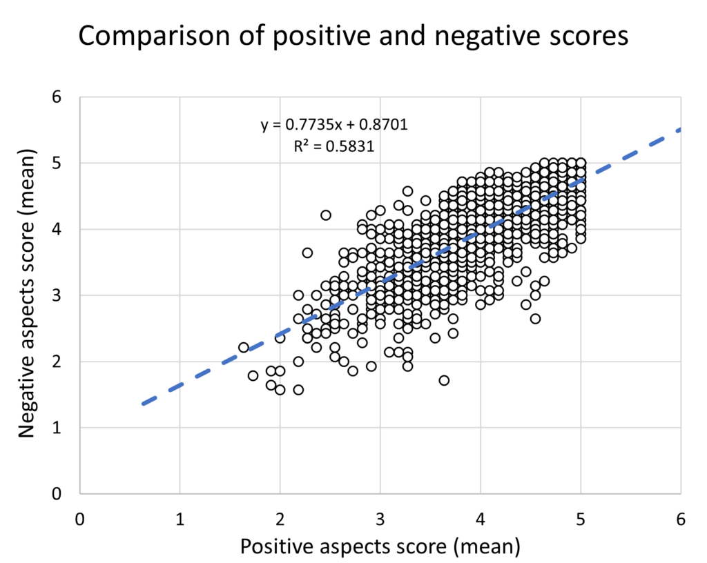 First, if there was perfect congruence between experiencing positive and negative aspects of limerence, the plot would be a diagonal straight line that went through the origin (the 0,0 point on the axes). As it stands, there is a clear positive correlation here (especially by the standards of social sciences; R2 = 0.58 for the aficionados), indicating that the two aspects are linked.