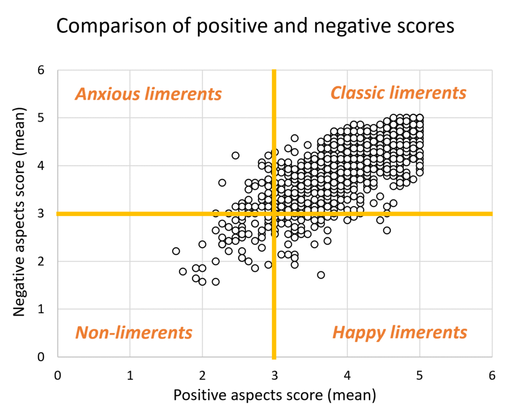 By this sorting mechanism, we can split people into classical limerents (82% of total), happy limerents (5%), anxious limerents (5%), and non-limerents (8%).