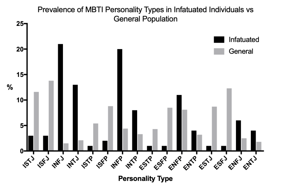 1. The ones highest on the infatuated spectrum are the ones starting with INF… introverts, intuitive people and feelers… makes sense that these show up as highest, no surprise…